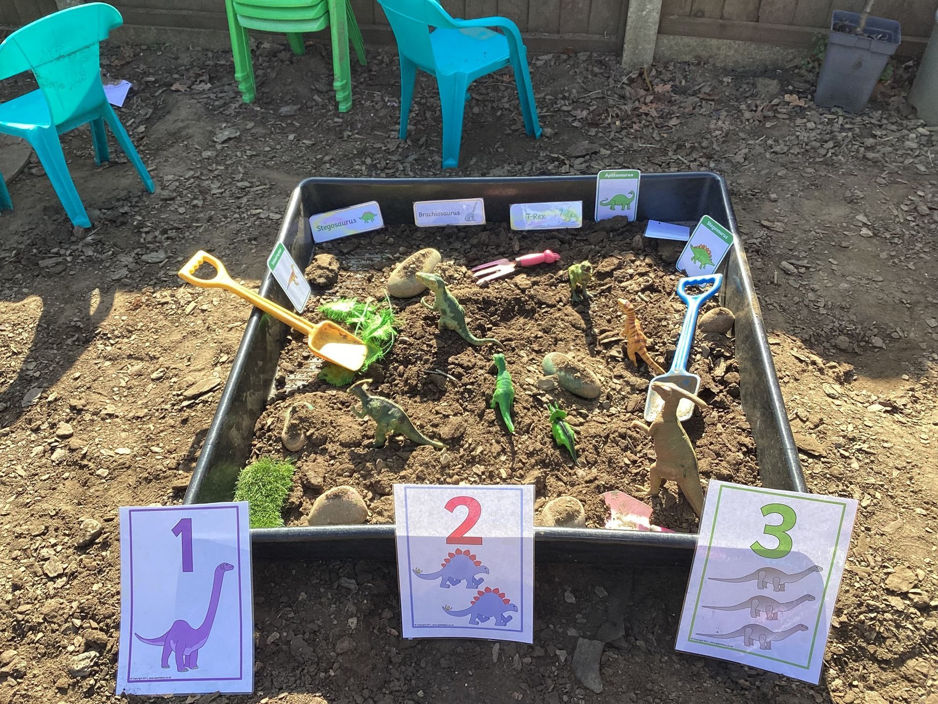 We set up our outdoor area with several different activities that link into the EYFS as well as following the children's interests such as construction areas, a reading area, small world area etc.